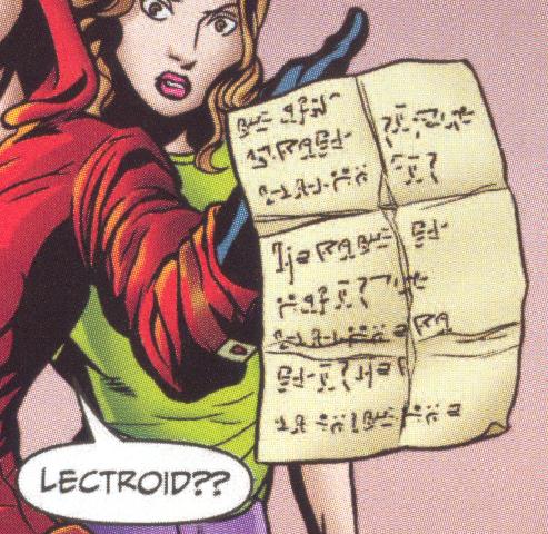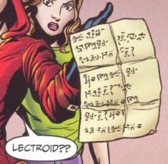 On page 16, panel 3, a sheet of alleged Lectroid writing is